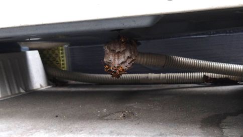 女王蜂(画像中央)も逃がすことなく駆除し、巣のあった木には戻り蜂の駆除用の薬剤を散布しておきました。