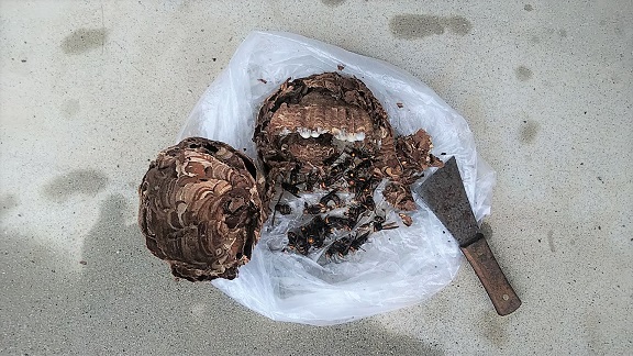 裏山の崖に営巣したコガタスズメバチの駆除及び蜂の巣の除去