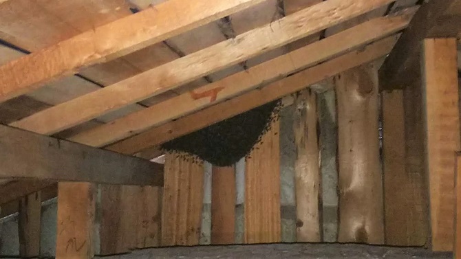 2階屋根裏に営巣したミツバチの駆除及び蜂の巣の除去